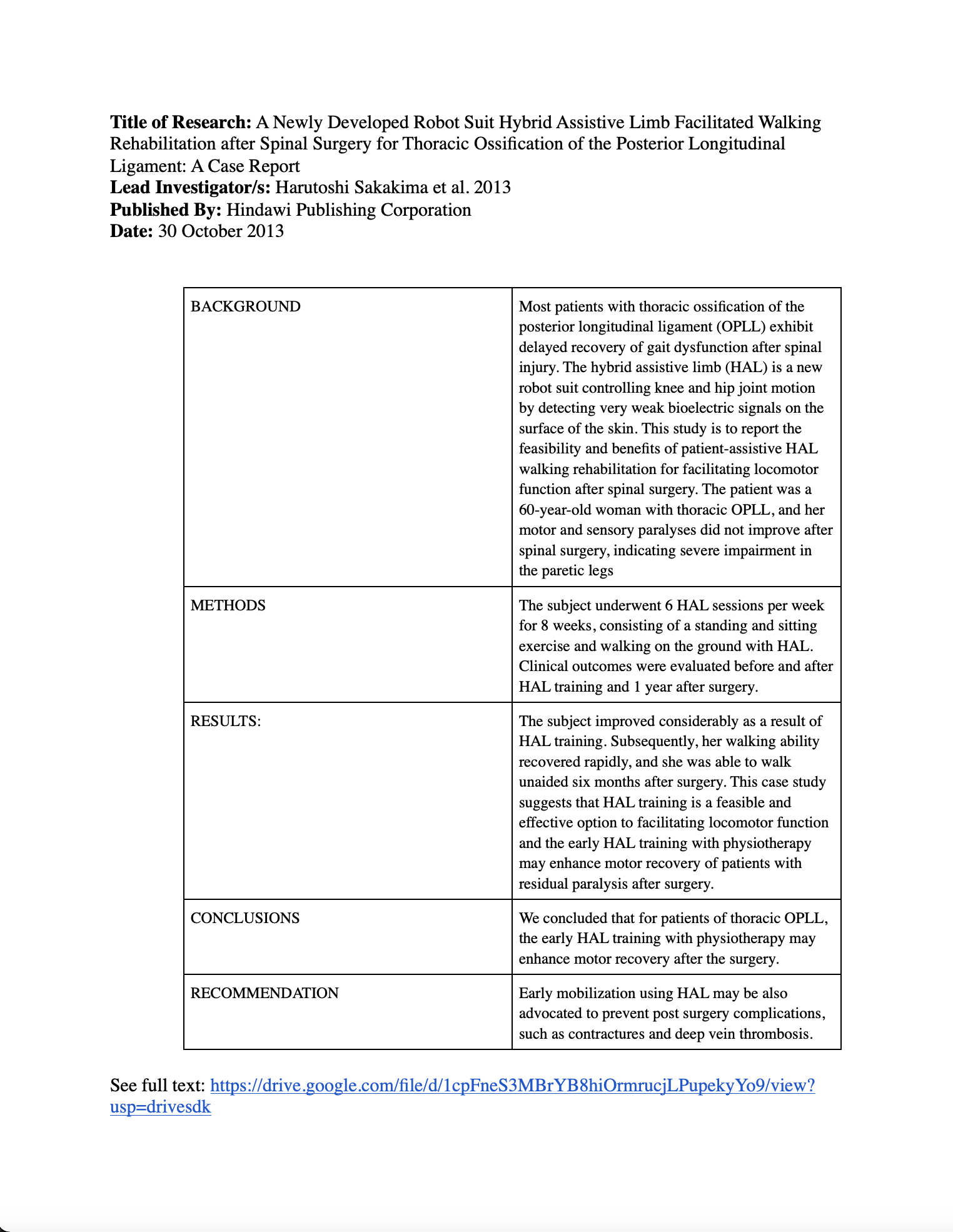 A Newly Developed Robot Suit Hybrid Assistive Limb Facilitated Walking Rehabilitation after Spinal Surgery for Thoracic Ossification of the Posterior Longitudinal Ligament: A Case Report